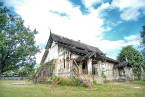 Today, the templeâs roof is damaged and propped up by wooden supports, yet its murals and altar remain remarkably preserved. Locals still come here to pray and offer incense, giving the site a quietly spiritual atmosphere amid the crumbling walls.